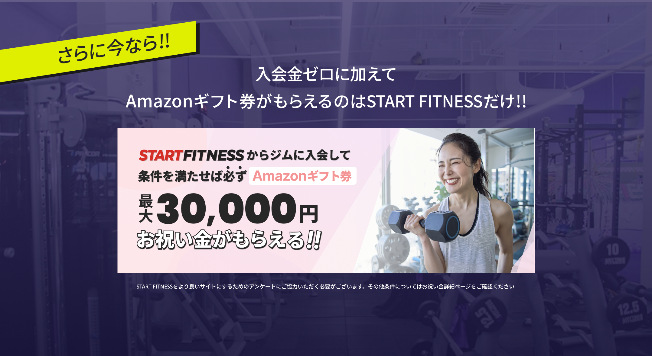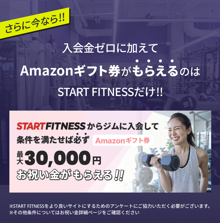 START FITNESSは、入会金ゼロで始めやすいジムだけを厳選した日本で唯一(※1)の検索サービスです。通常は入会金が必要なジムでも、START FITNESSから体験・見学予約すれば、入会金はゼロ円です。プレゼントのギフト券は、各ジムからSTART FITNESSに支払われる掲載料を還元しています。入会するプランによってギフト券の額が異なりますので、お祝い金詳細ページにてご確認ください。また、START FITNESS以外からご入会の場合はプレゼント対象外です。