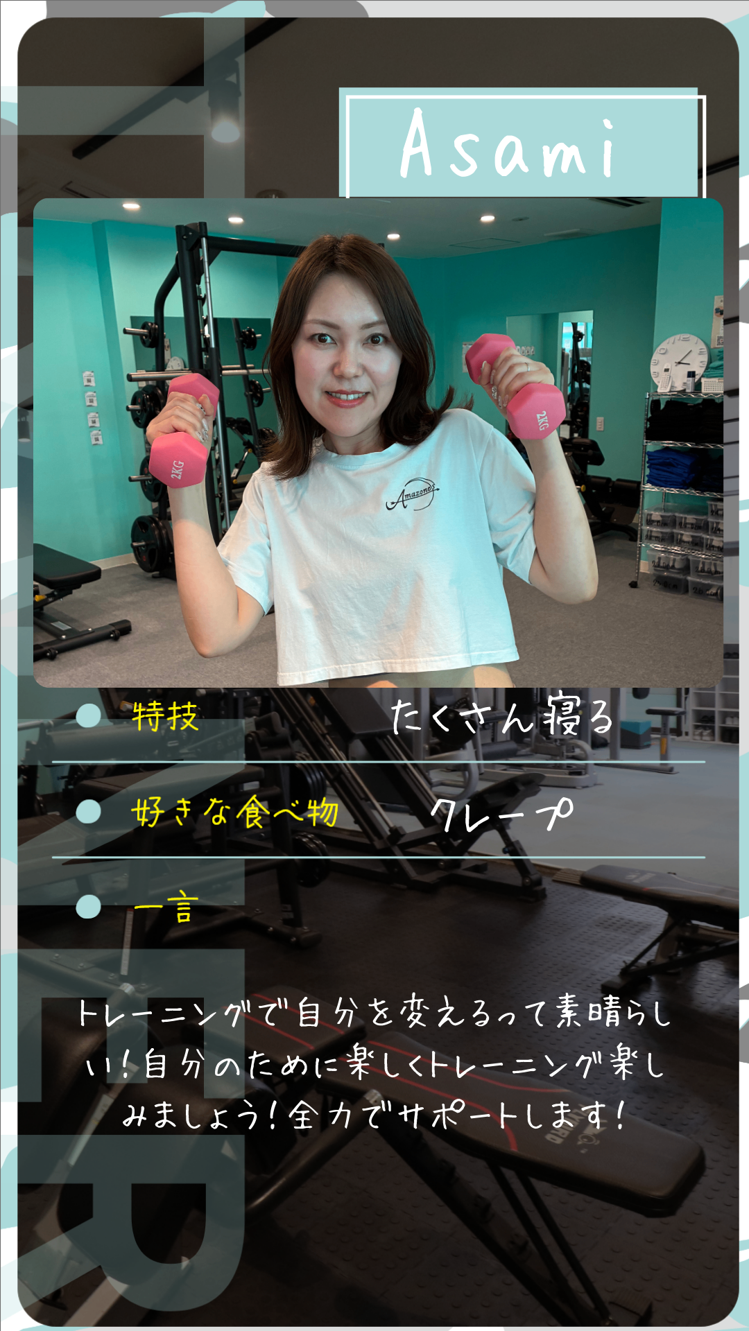 清水朝美トレーニングで自分を変えるって素晴らしい!自分のために楽しくトレーニング楽しみましょう!全力でサポートします!